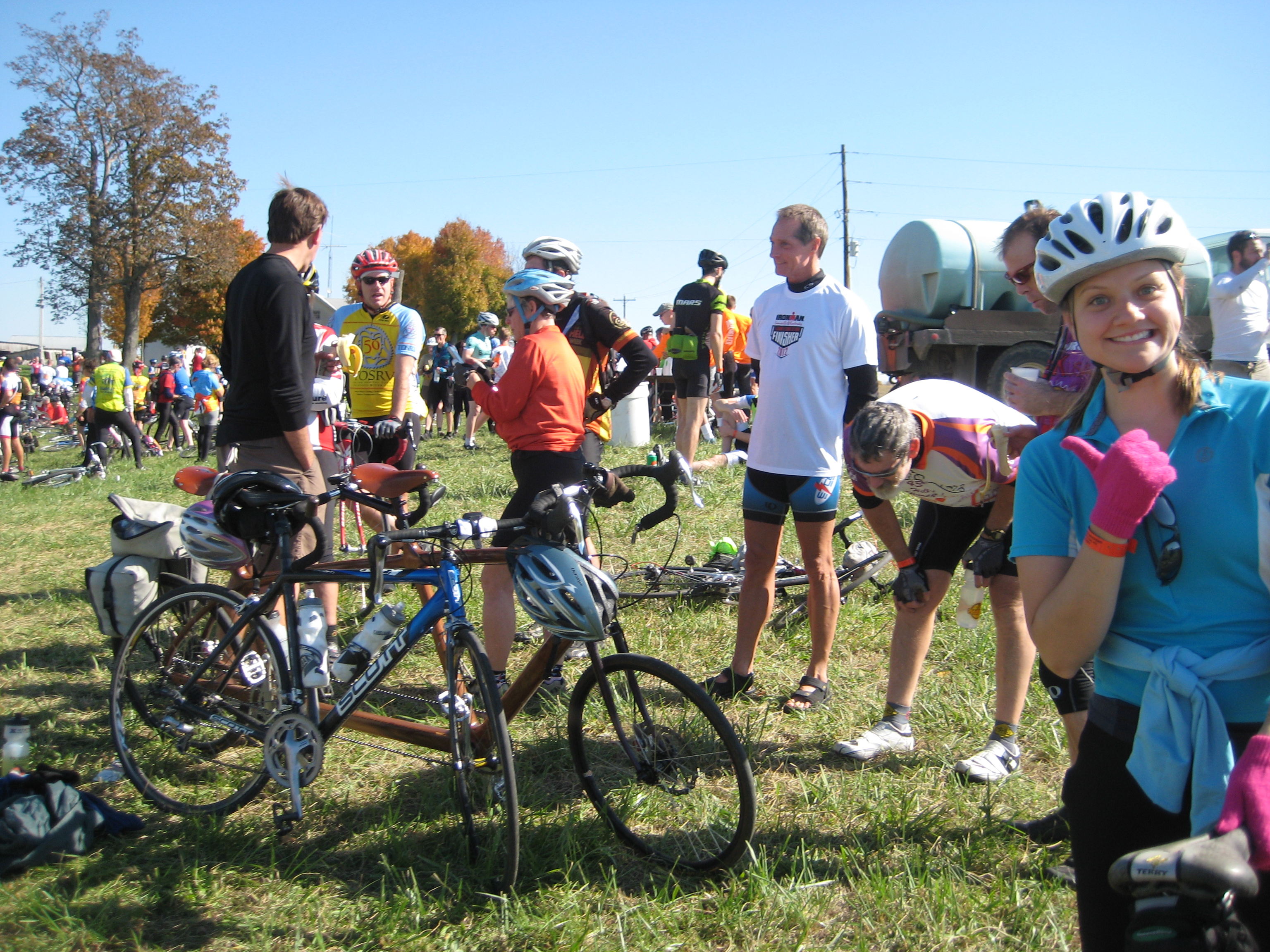 Nate and Catherine work for Cummins in Columbus, Indiana so we commuted about an hour each day to the Bloomington area. We were physically and emotionally spent after the ride on Saturday. It was very difficult to muster the moxie to get back in the saddle on Sunday. It was cool enough Sunday morning to require windshield scraping but the sun was out bright and strong. What a difference the sun can make. The cycling crowd was giddy and the fall colors were dazzling. Andrea and I had an unusual set back about two miles from the first rest stop when our front derailleur cable failed. We were able to limp along in granny gear to the first rest stop and purchase a new cable. Note to self: always carry a spare, tandem-length cable.