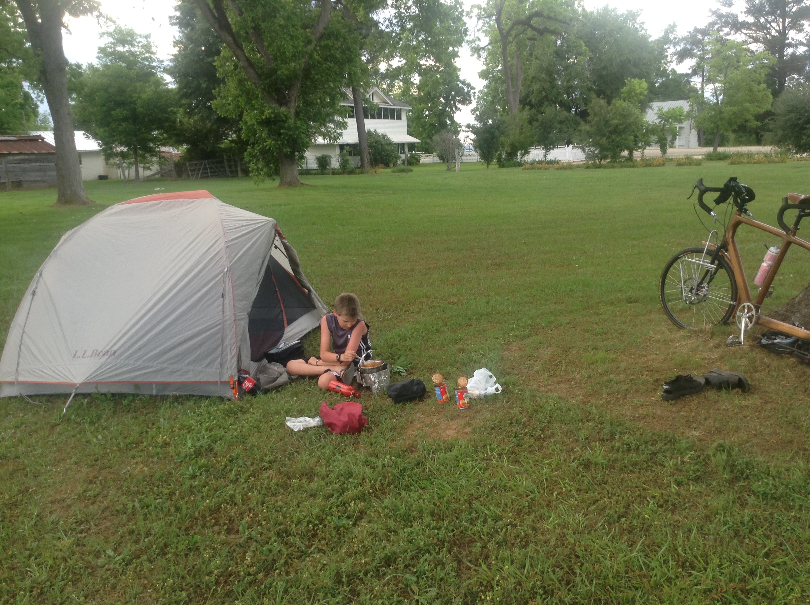 We got to Purdue Hill, and I’d had enough. It was about another 25 miles until Grove Hill, the next town of any substance. There was no official place to stay in Perdue Hill so we asked the owner of a grocery store if we could camp behind the store, and he said yes. I took a garden hose shower tonight and pitched our tent. We had visions of staying in a hotel in Grove Hill, but that isn’t going to happen. This is what bicycle touring is all about.