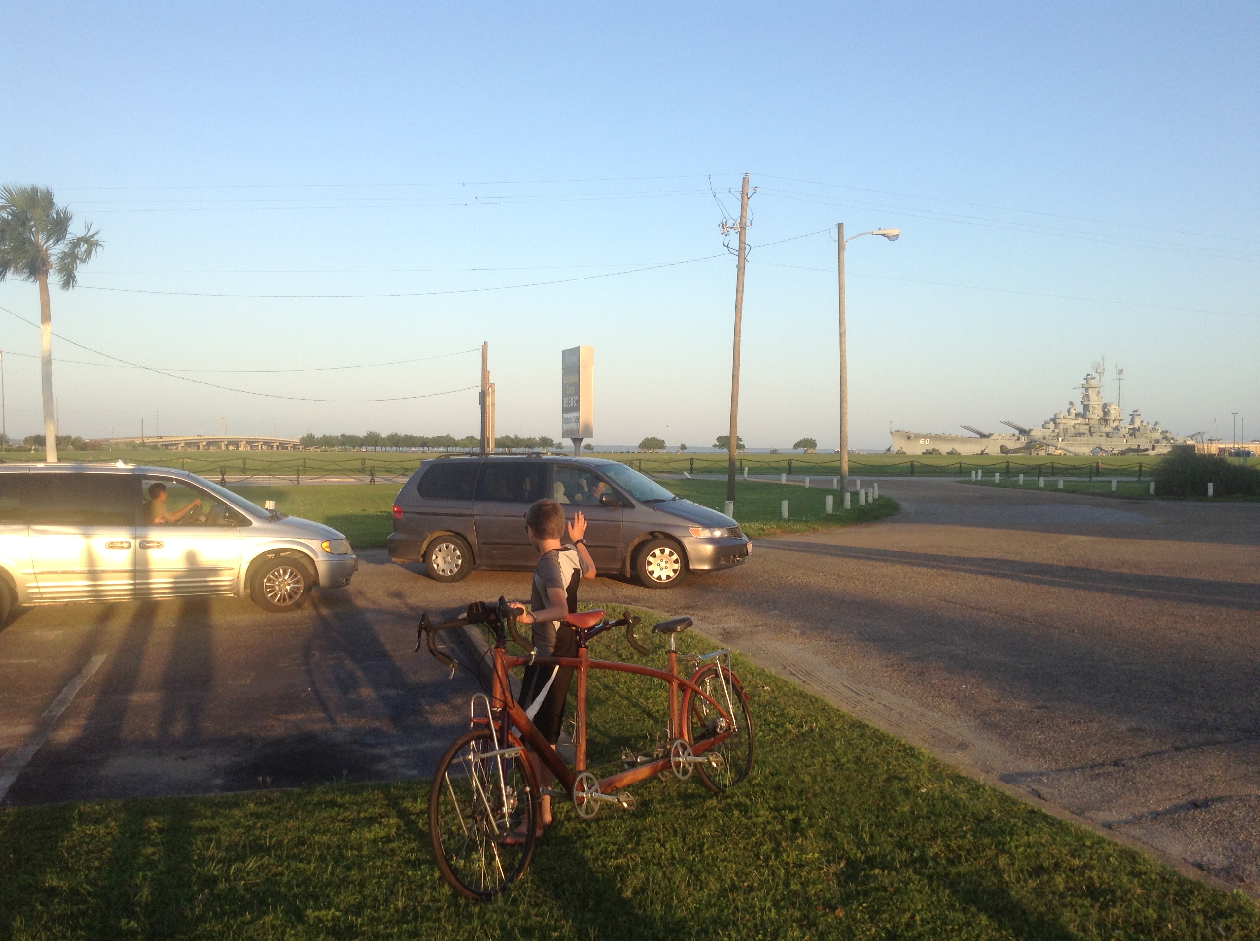 Hey Mom, this is Ben. I got up pretty late this morning. I think Dad sent a picture of me sleeping lazily in the hotel– it was so comfortable. I had my own big bed. We got up, we got dressed and everything. We could see the Battleship from here. It was so pretty. It looked really cool. We could see the tanks and all the airplanes and the submarine. We got on our bikes and set off. We were biking and biking. All of sudden we hit the highway that crosses the Mobile Bay off the Gulf of Mexico. There was a huge bridge and semi trucks going past us – it was crazy! Then we got to the land and we saw all these seafood places, like bass and I didn’t think of eating bass or lobster for breakfast. That doesn’t sound too good to me. Finally we got to a campground and we stopped to check it out – it’s where we had considered staying last night but decided to stay back in Mobile. You could see the Gulf of Mexico from there – you could see so far out into the ocean; it was amazing. From the bridge, the gulf didn’t look too clean but apparently it was just really shallow and sandy. I walked out into the water and all of a sudden a crab just shot right past me! Dad dipped the back tire of the tandem into the Gulf and after we cycle the whole way to Ohio, we’ll dip the front tire into Lake Erie and have cycled America the whole way from south to north. We played in the Gulf a bit more and picked up some driftwood for a souvenir. We started biking again but got lost and couldn’t find ourselves. We stopped at a visitor center and this lady came out with a huge Southern accent. She gave us a bunch of directions and ideas on good places to eat and how to get on the highway and stuff. We began pealing again and her directions didn’t help us one bit. We found an abandoned store place that was creepy. There was a guy walking in. We asked him directions and he told us so much valuable information, like creeks that are good for water and how to get to Highway 225. He also told us about a Subway we could go to for lunch but we didn’t want to do that. We found a different store and stopped and got some poppy seed muffins which of course I wanted; Dad got a blueberry one. We got a juice and went out by our bikes and ate. We drank the whole entire jug of juice; we were so dehydrated. I felt so good after that. The guy who gave us directions told us Highway 225 was super hilly but we weren’t really thinking about that. We got on the highway and it was so hilly, it was crazy. We were going up and down and up and down. The hills were so long but the downhill on the other side was so steep, we went really fast and didn’t get much break. Finally we got past all that and ended up in a sketchy town that was creepy. It was like an old-fashioned creepy place with a store with bars on the windows. The door was a gate with a metal door that was open. We went in and the people in there were really nice. We got some some stuff and left. The people told us there was a good restaurant across the street. We ate there. They gave us directions to the campsite where we are now. They were so nice, they let one of their chefs who had a pickup truck take us to the campsite which was like 4 miles away. The owner of the camp came out and saw the bike and was like, “Wow!” and stuff. He was so nice, he let us use one of the golf carts to get over to the campsite. He was just great. Dad asked how much for the site and he said, “Free!” because we were bikers and just had a tent. Now we’re just sitting around and Dad’s taking a shower.