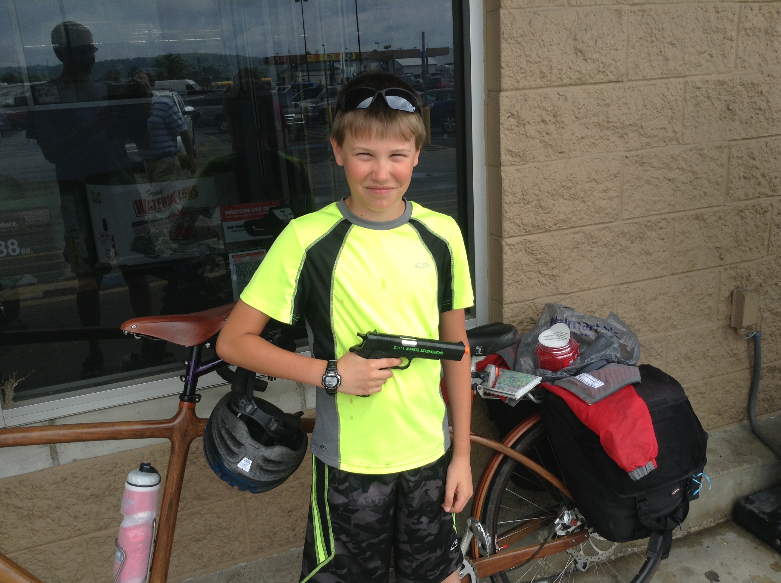 When Dad woke me up, I opened my eyes, and bam! a shot of light went into my eyes. I was like, “Ohhh, that’s not nice.” He, of course, had the shades pushed to the side, so all the light was coming in, plus the lights were on—a horrible wake-up call. When I finally got up, I was scrambling all over the place, tripping over the bed. We finally got out to start pedaling . When we left there was this old abandoned hotel nearby. There were mattresses along the windows, and looked really creepy. A sign said, “Closed for Renovation.” We stopped at a Walmart and Dad bought me an air soft gun! I was so happy because I can shoot dogs now that go after us. When we got to the country roads, sure enough I got the opportunity. It was so fun. The first one came right up behind us. It was a really mad dog. I turned around and shot him right between the eyes. I was like, “Yeeees! I did it!” It was fun, but it was really cruel, too. My conscience was kinda not happy, but I was having so much fun. I was shooting dogs and keeping them away from us. The terrain wasn’t too bad today, except for one ginormous hill after we had lunch. I was like, “Ugh, I don’t think we can do this.” Then, Dad took a stop in the middle of the hill, and I was like, “How are we going to get going again?” Finally he was ready. Somehow, I don’t know how, Dad got to a start, and we were off. We got to this town where we set down our stuff and found some food. We went to a Chinese buffet, and had these cakes that were so good. They were doughnuts with sugar on them. I called them hotcakes since they were so hot. They were really good. We ate too much.