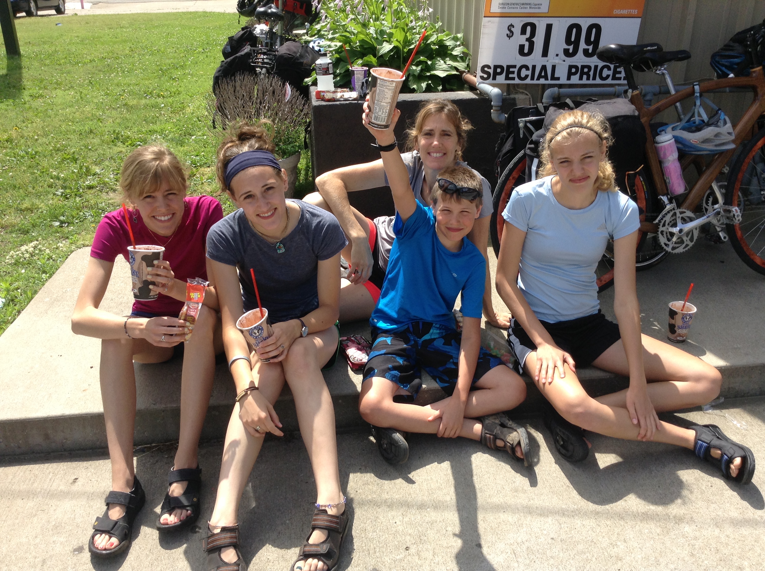It did not rain as predicted last night, nor was it raining this morning. Instead it was one of those blistering hot days when some precipitation would be most welcome. I felt like a giant sweat ball when we arrived at Debbie’s house. She greeted me with a big hug in spite of my warning. Debbie’s teen-age daughter, Emily, chalked a giant welcome sign on their front porch. We were treated to some mint tea as Debbie and I tried to catch up on score-plus years of life. Ben and Emily really hit it off. Emily is an accomplished musician and an enthusiastic marksman, just like Ben. Debbie and I were humored by their conversation about muzzle velocities of various air-soft guns. Our visit was limited to about an hour because Andrea is in route to meet us today to take us home. We started pedaling east again to close the gap between us and Andrea as much as possible.