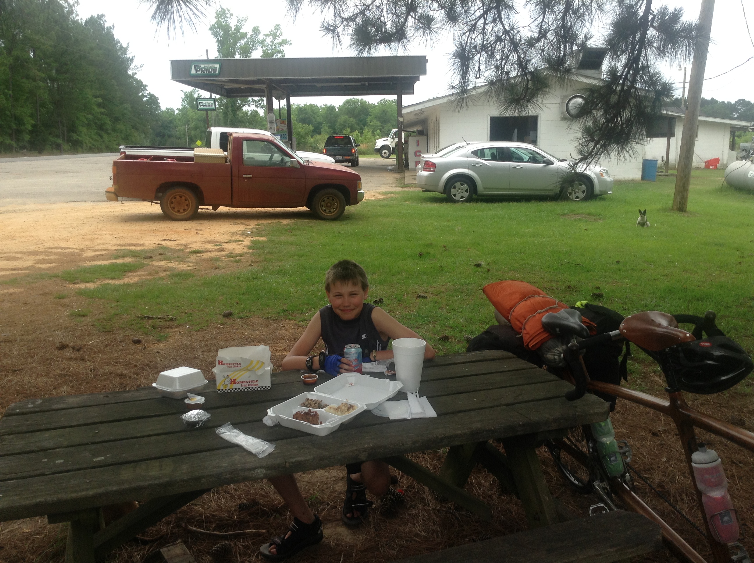 We went through a place called Little River, and we thought it would be a pretty big place. We saw some little tiny towns that said it was pretty big. So we got to Little River, but we didn’t know that we were there. We saw a gas station, but we passed it and kept on going, but then nothing was there. It was just a bunch of trees and stuff, and we didn’t see a town, but we should have been there. Then Dad was like, “Was that gas station it?!” So we went back, asked someone in the gas station, and he was like, “Yep! This is it!” So we ate some lunch there. I had chicken tenders. It wasn’t too good. Dad had meatloaf. The meatloaf was the best. There were also dogs, and one hanged out with us, and I gave him the rest of my chicken tenders. After that, we left and got to a little bit bigger town and saw a gas station. We were going to have to do a really long day today, but Dad couldn’t take it anymore. So we just stayed there. We got some bananas and stuff. The bananas were pretty good, after all the day of only having granola bars. It was really good. That was around 3:00—central time.