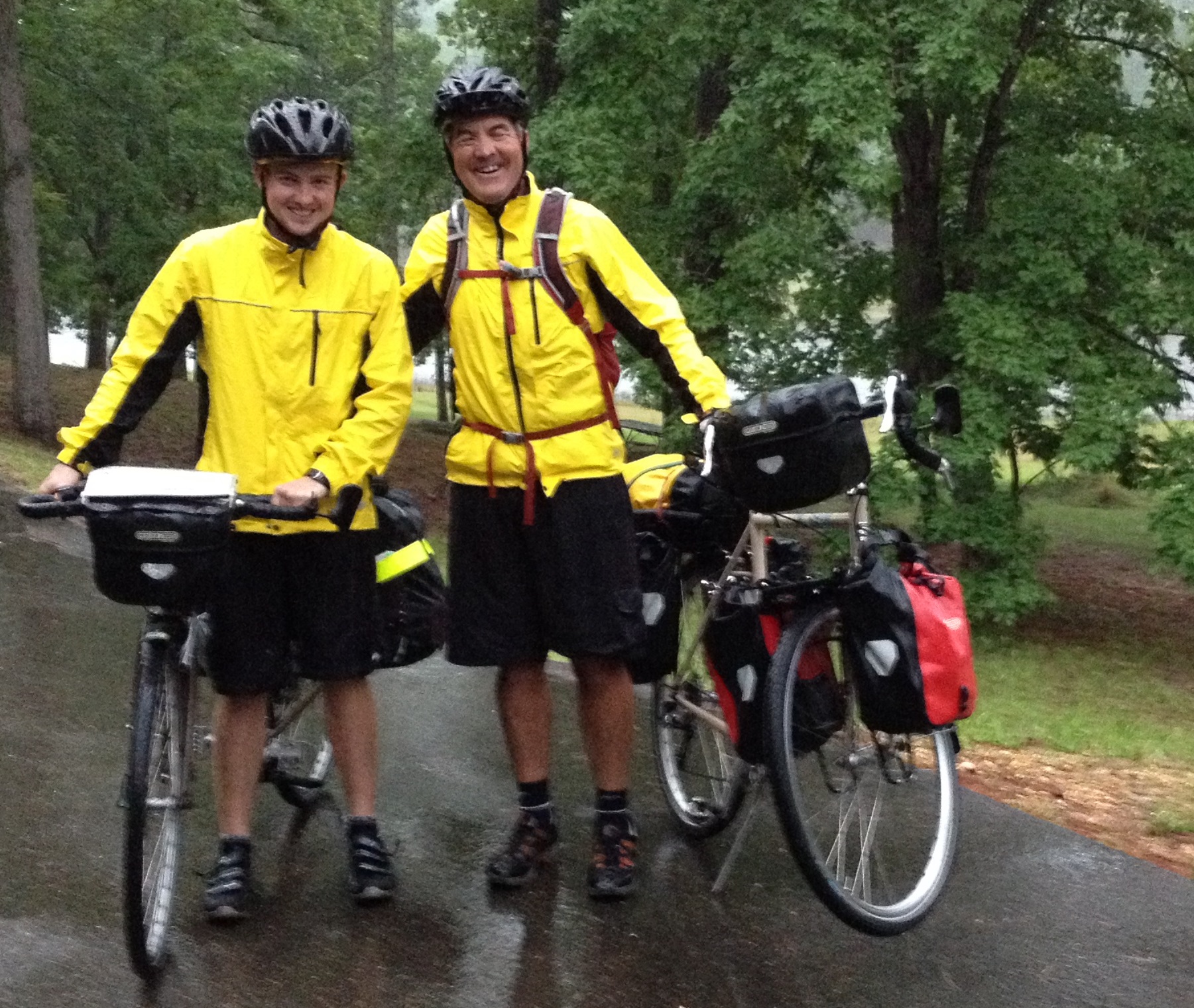 We had severe thunderstorms last night, and it was absolutely pouring rain at daybreak this morning. Terry and Garrison seemed undaunted by the rain and courageously packed up, ready to roll by 7:30. Ben and I emerged from our tent briefly to have a quick time of prayer and bid farewell to our new-found friends. We then crawled back into our tent and sleeping bags and listened to an audio book “The Adventures of Tom Sawyer”. Sometimes the freedom and adventure of cycle touring makes me feel a bit like Tom Sawyer or Huck Finn. Time means very little, and we hardly know from one moment to the next when our next meal will be and where we will spend the night. Our daily wardrobe is comprised of two outfits. We might as well be barefoot on a homemade raft, floating down a river, fishing for our dinner. Reality snaps back into focus when I remember my mortgage, two kids in college and the four “wrecks” that we drive and have to maintain.