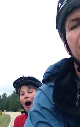 It was raining this morning when we woke up. We took our time leaving. The rain slowed down significantly by 10:00 so we headed up to town and ate a big breakfast at the Huddle House. Conditions today were quite pleasant, overcast, a bit of a tailwind, cool; really nice cycling. Ben has been very active shooting bike-chasing dogs from the rear seat with his air-soft gun. His ammo (6mm diameter plastic BB’s) accidentally fell off the bike. The bag broke open and spilled on the pavement. We stopped and tried to scoop up as much as we could. While in process, a couple cyclists came up on us – father and son team as well – Terry, the father, and Garrison Whitmore. They’re riding cross country. Terry is 56 years old and retired from the FBI. Garrison is 19 years old, majoring in Geography at Auburn University. They are riding “in honor of a little girl named Rachel- a courageous little girl in need of a heart”: http://www.facebook.com/RideforRachel2014?ref=profile. It didn’t take long to discover that Terry and Garrison are fellow Christians. We had dinner together and shared a campsite at Tishomingo State Park. It was amazing how in God’s providence a spilled bag of BB’s brought us together.
