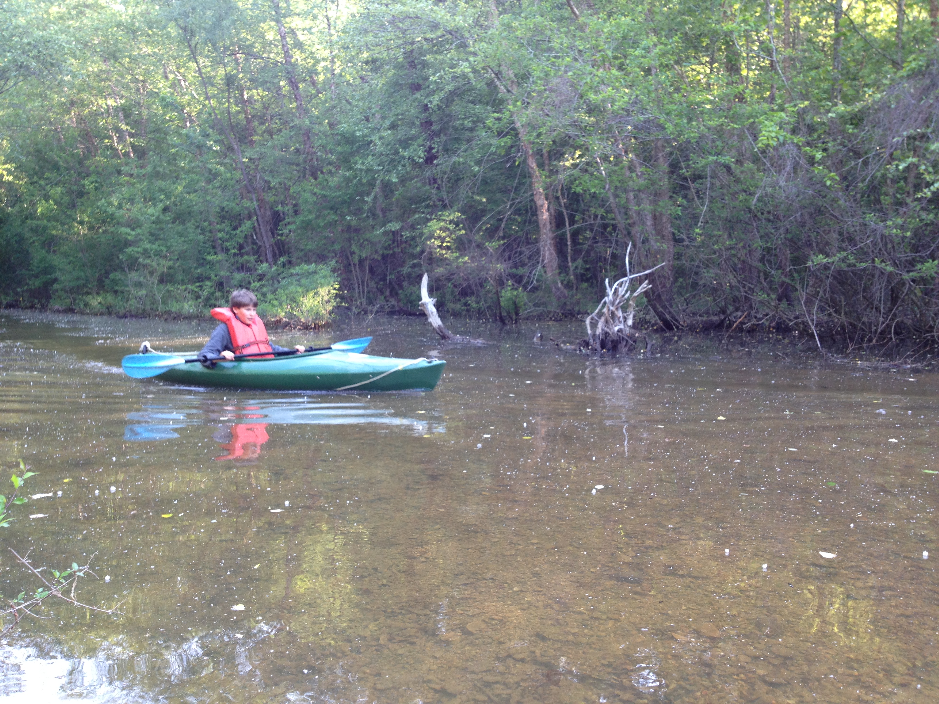 Michael took us kayaking on the Tennessee River early this morning. We took his four-seat, Polaris Ranger down the narrow ATV trail to get to the river. A ranger is an off-road, four wheel-drive vehicle with a full roll cage, high ground clearance and aggressive tread tires. It’s like a large golf cart on steroids. A couple hundred yards down the path, Michael decided it would be a good idea to let Ben drive the ranger. Ben was excited and took off rather fast. He didn’t have a good feel for the throttle. This was also the first time Ben has driven something that was left-side steering. He has ridden dirt-bikes and ATV’s, and in both cases they steer from the center. Consequently, he tried to drive the Ranger with his body centered on the trail which meant the right side of the vehicle was precariously close to falling over the ravine. Michael calmly coached Ben to drive more toward the left while making statements like “Oh, we wouldn’t want to go off the edge here because we would probably all die.” I was in the back seat as nervous as a cat in a room full of rocking chairs. Ben eventually got the hang of it. After our kayaking & rangering adventure we had a nice oatmeal breakfast, and Michael took us back down the ridge to our bike route. We pedaled through Camden which was large enough to have a Walmart. I prefer to patronize the smaller mom & pop type stores, but Walmart had something we were after: weapons! As I mentioned before, we use an air-soft gun to deter aggressive dogs. We have had an overabundance of dog chasings on this trip. Once we had five, uncollared, large dogs come after us at the same time. Ben emptied his clip, and they still kept coming. We almost wrecked. We were looking at Walmart for a second clip of maybe a second gun. I’ve gotten flack from folks that read my blog and accuse me of cruelty to animals. They probably don’t understand: a) a 6mm (~1/4 inch) diameter, plastic, air-soft bb is pretty harmless; a point-blank shot will sting and leave a red mark but it will not break the skin, b) dogs chasing bicycles can be extremely dangerous for the rider and the dog c) Ben and I are huge dog lovers. One time we were on a pretty busy road and a whole pack of dogs exploded from a front porch and crossed an oncoming lane of traffic to chase us. We heard the screeching tires and the sickening thump of car-on-dog. The dog limped off. Benjamin was mortified. “Dad, we have to go back and tell the owner.” The last thing I wanted to do was beat my way past a pack of angry dogs to knock on a door of someone who may be equally angry. We turned around anyway and went back. Fortunately the owner must of heard the commotion, too, because he was already out of his house. The dog seemed to be gimping but okay.